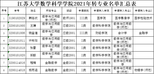 根据《黄色小说 本科生转专业实施办法》(江大校【2018】10号)、《关于做好2021年本科生转专业工作的通知》(江大教〔2021〕71号)等文件精神,经个人申报、学院审核,现将符合条件的同学公示如下: