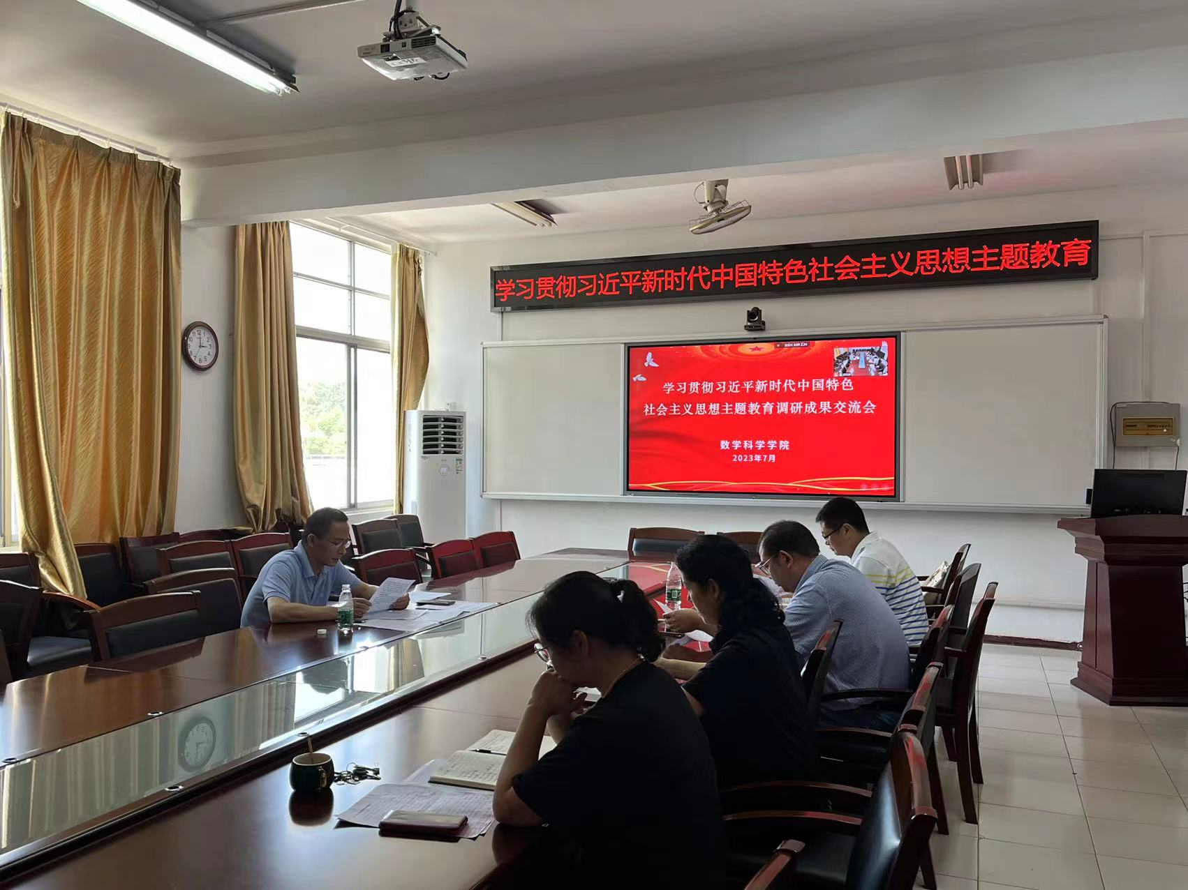 7月31日, 数学科学学院在动力楼206会议室召开学习贯彻习近平新时代中国特色社会主义思想主题教育调研成果交流会。会议由学院党委书记张世兵主持。