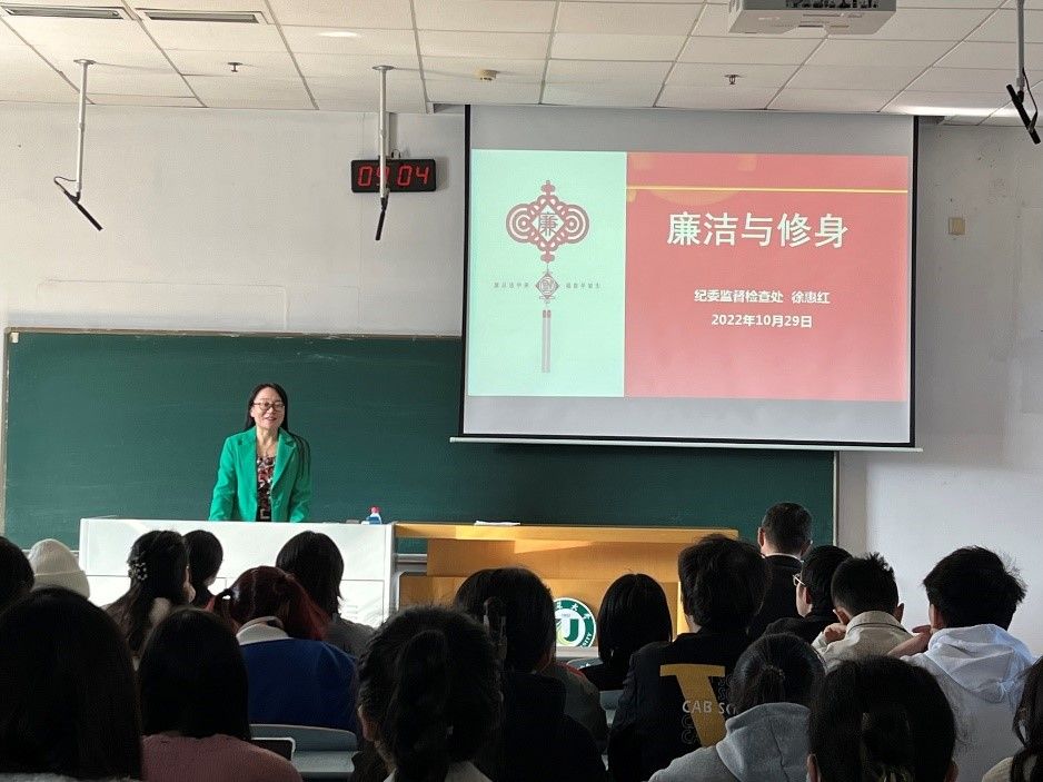 邀请校纪委监督检查处处长徐惠红,在三江楼附楼201开展《廉洁与修身》专题讲座,学院全体学生党员及入党积极分子参加,会议由院党委书记张世兵主持。