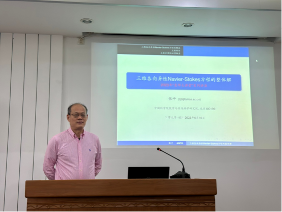 Vice President Professor Chen Hong introduced the research experience of Academician Zhang Ping to the teachers and students in room, and encouraged the graduate students to learn the spirit of no fear of difficulties, and focusing on their own research longer from Academician Zhang. Academician Zhang’s topic is "On the global solution of the three-dimensional anisotropic Navier-Stokes equation". He reviewed the classic results of the global well-posedness of the three-dimensional anisotropic Navier-Stokes equation firstly, then introduced the existence of the recent global analytical solution in details. In the end, he encourages the teachers and students to continue exploring and researching this issue.